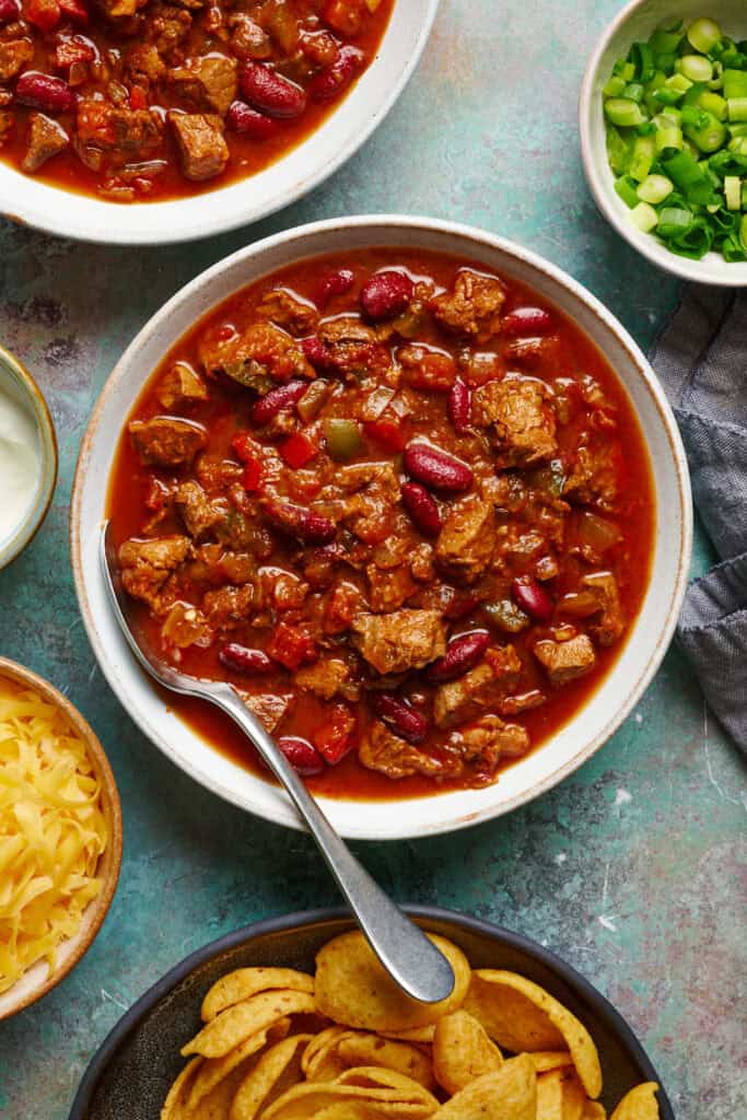 No need for top sirloin or fancy cuts of beef because this chili simmers for 8 hours (or more). Cooking cheaper cuts of meat low and slow tenderizes them so that they melt in your mouth when it's time for dinner.